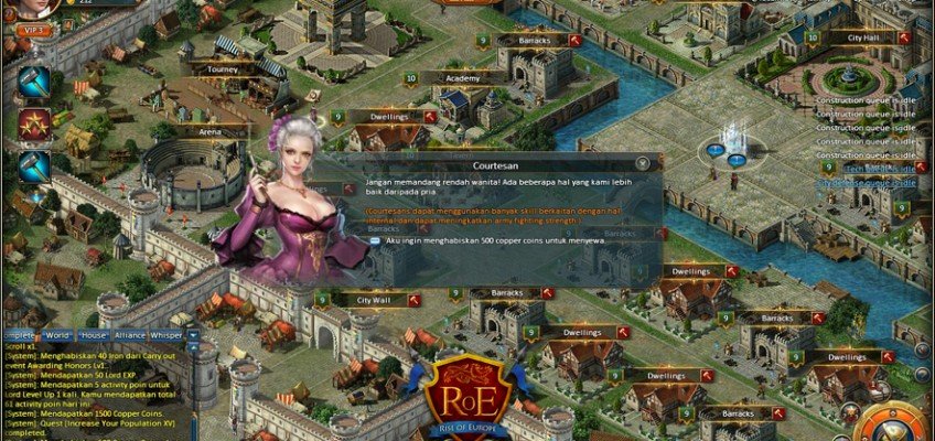 Po wejściu na główną stronę gry od razu załapiecie na czym polega cała rozgrywka, i tak, Rise of Europe jest kolejną strategiczną grą, gdzie będziemy budować i ulepszać wiele różnych budynków, aby wzmacniać swoją siłę i móc w końcu pokonać swoich wrogów. Większa część naszego miasta jest podzielona na coś w stylu siatki, gdzie możemy budować zarówno baraki, sale szkoleniowe, siedzibę kowala, magazyny i wiele innych. Aby mieć większą ilość pracowników musimy dbać, aby ono jak najlepiej prosperowało, a w celu dostania większych możliwości i dostępu do szerszej palety przedmiotów musimy budować i zdobywać coraz to wyższy poziom naszego lorda i herosów , których najmiemy w tawernie. W przeciwieństwie do innych strategii i gier społecznościowych, gdzie musimy za walutę premium rozszerzać swoje miasto, Rise of Europe daje nam od razu potężny teren, którego zapełnienie zajmie nam długie miesiące. Niektóre z budynków i dekoracji nie trzeba ulepszać jak choćby Areny i Sali Sław. Dostaniemy do nich dostęp wraz z naszym postępem. Co ciekawsze Arena wcale nie jest miejscem, gdzie będziemy mierzyć się z innymi graczami. Wchodząc na nią zmierzyć się możemy z potężnymi hordami wrogów. Za każdym razem jak zakończymy jedną rundę musimy odczekać kilka minut zanim przejdziemy dalej. Sama walka w prezentowanej browserówce odbywa się automatycznie, ale wynik walki i tak zależy od naszej strategii, gdyż to my wybieramy rodzaj formacji i broń/zbroje/przedmioty jakie noszą nasi bohaterowie. Jak już rozpocznie się bitwa to nie znajdziecie tu nic ciekawego. Grupy żołnierzy przesuwają się po planszy i szukają okazji, aby uderzyć na przeciwną drużynę. To co najbardziej mnie tutaj podirytowało to fakt, że gdy naszemu przeciwnikowi zostaje już kilka jednostek to po prostu decyduje się na ucieczkę, ale nasza armia może go ścigać. Jednak mi się nigdy nie udało złapać wroga na nowo.